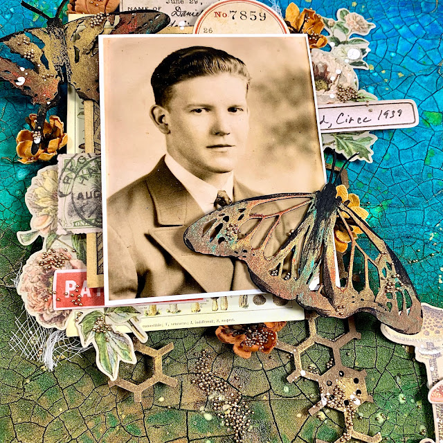 As crackle is my jam, that's where I began with this piece. It dried over the course of several days before I began working on the project. My color choices started as a combination of pastel mint green and a very pale blue. I loved that combo but felt I needed to go darker with this vintage and masculine vibe. So, I started layering my 13 Arts colors until I achieved what you see here. The only media not 13 Arts was a splattering of Tim Holtz Wild Honey Oxide.